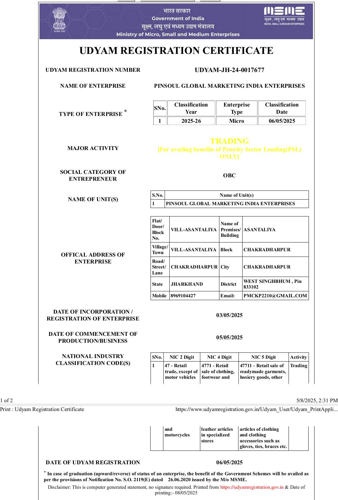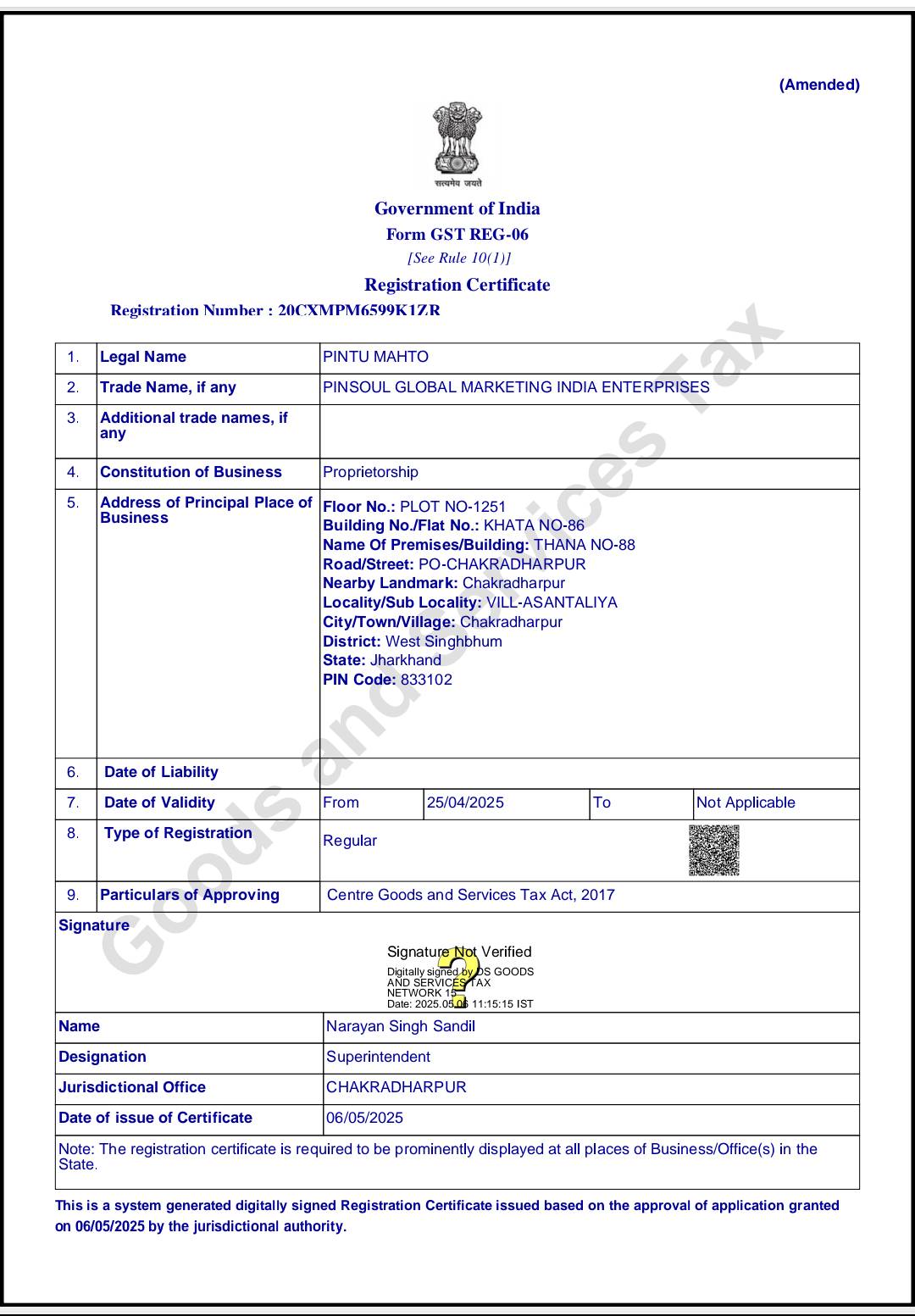 Pinsoul Global Marketing India Enterprises is a dynamic and growing company based in Chakradharpur, Jharkhand, with a strong foundation in Multi-Level Marketing (MLM) and over 8 years of experience in product distribution and direct selling.